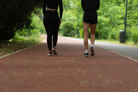 Two girls walking together on the red running track, close up