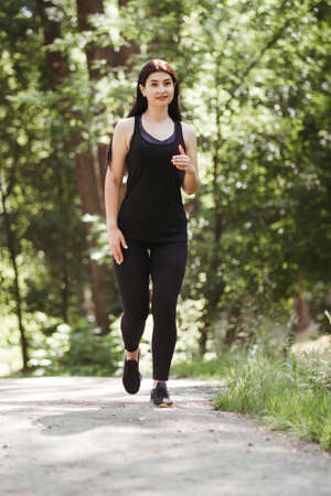 Young woman with weight excess runs in the park. Girl with curvy figure goes in for sports to lose extra pounds