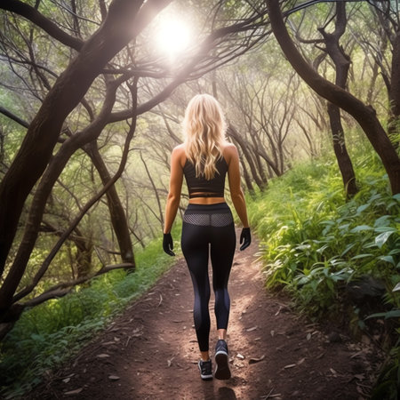 A fit woman with long blonde hair jogs along a scenic path, surrounded by lush greenery and dappled sunlight. Her athletic attire and focused expression convey determination and vitality, embodying the spirit of an active lifestyle.