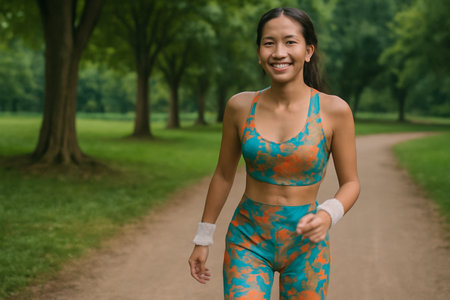 AI generated image of a 19-year-old Thai woman smiling in colorful abstract activewear, walking through a park radiates joy and confidence, her vibrant sportswear reflecting her energetic personality