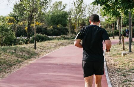 Young man in sports clothing jogging in park next to promenade