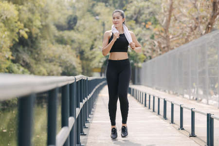 Young girl asian running exercise on street and muscle building and slim fit body nice perfect nature background blur