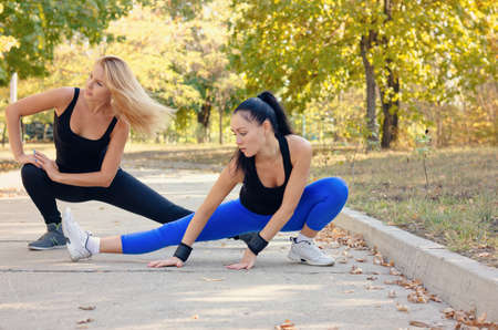 Two fit athletic young woman working out together on a road in a park doing stretching exercise and leg extensions to improve suppleness and mobility