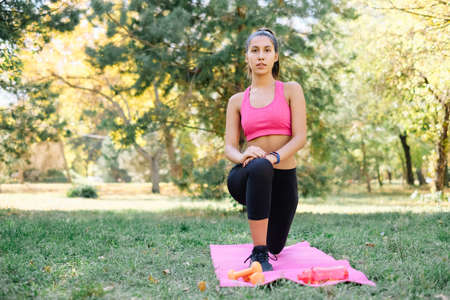 Fitness woman with personal trainer doing exercises on mat outdoors