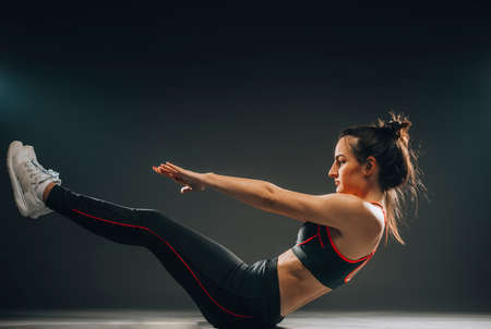 Young slim brunette fitness woman stretching on dark wall background