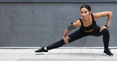 Sport woman squatting for warm up before fitness training. Athlete woman doing stretching exercise in city street near multistorey buildings.