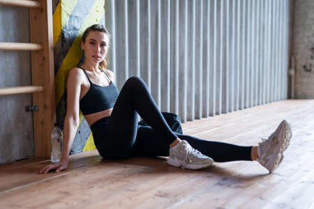 Young caucasian blond fitness woman sitting on a mat on a concrete floor. healthy lifestyle