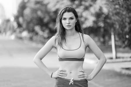 Portrait of a beautiful young sporty brunette girl. Black and white photo. BW