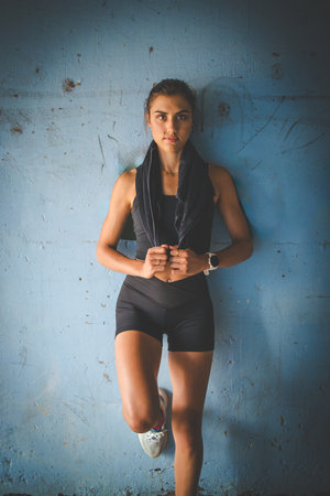 Young girl trainer in sportswear with a towel around her neck during a break between workouts on a blue background.