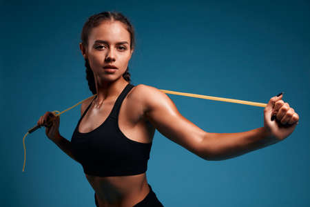 sexy girl doing exercise with skipping rope. sportswoman having a rest after jumping. close up photo. isolated blue background, studio shot.