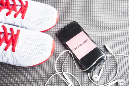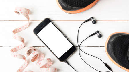running shoes,measuring tape and phone on white wood table black and white tone color style