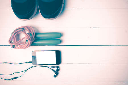 fitness equipment : running shoes,jumping rope and phone on white wood table vintage style