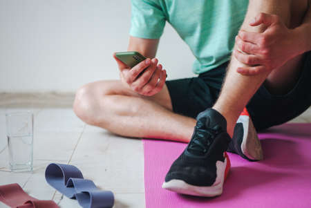 Man standing on the phone to see when the online fitness lesson begins. Healthy lifestyle. Quarantine lifestyle. Online training.