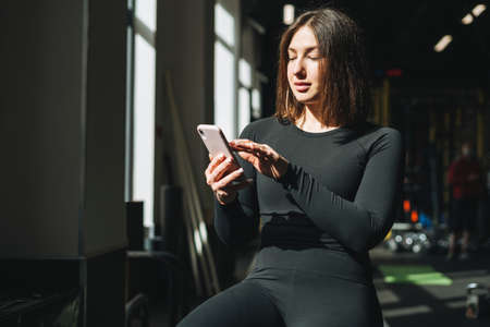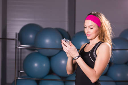 Beautiful woman using mobile smartphone during workout at fitness GYM