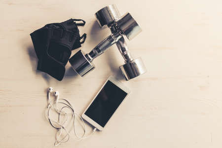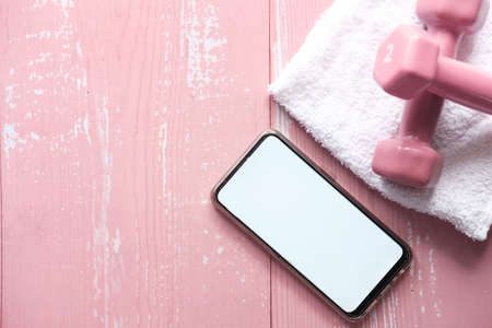 fitness app. Smart phone screen with fitness health or sport gym mobile application on dumbbell background. App for training indoors