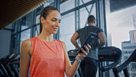 Beautiful Athletic Woman Uses Smartphone Walks Through Fitness Club Gym. Using Social Media, Posting Pictures, Communicating, Checking Email. In the Background Sports People Running on Treadmills