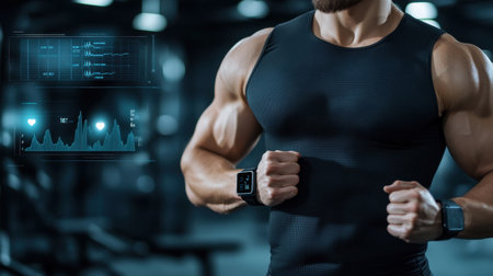Athlete interacting with virtual screen displaying performance data, visualizing heart rate and other fitness metrics