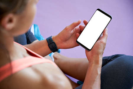 Fit sporty woman holding phone mock up white screen using fitness yoga app.