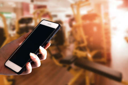 Hand holding smartphone device at gym background. interior of modern fitness center gym with equipment
