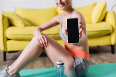 Cropped view of smiling sportswoman showing smartphone with blank screen near sports bottle on fitness mat