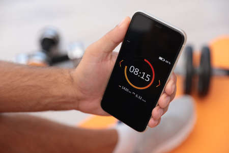 Fitness app. Cropped shot of a man using his smartphone while sitting on yoga mat at home