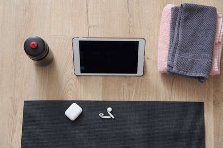 Top view of tablet, headphones, yoga mat and towels before workout. Yoga or fitness concept