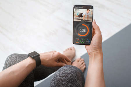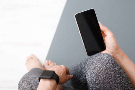 Physical activity check. Woman in sweatpants sitting on floor on mat with smart watch, holding smartphone with blank screen on hand, cropped, free space