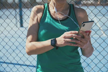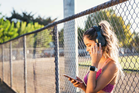 Young sport woman using black wireless headphones and setting a music playlist on her smartphone before working out.