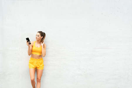 Young caucasian athlete looking at her mobile phone. Woman in sportswear browsing through social media using her cellphone on gray concrete background. Fitness concept. Technology concept. Copy space.