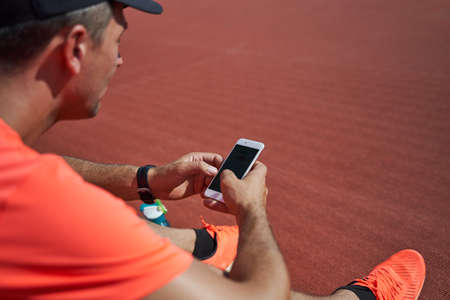 Sports man takes a break and relaxes after training or running around the stadium and using a smartphone.
