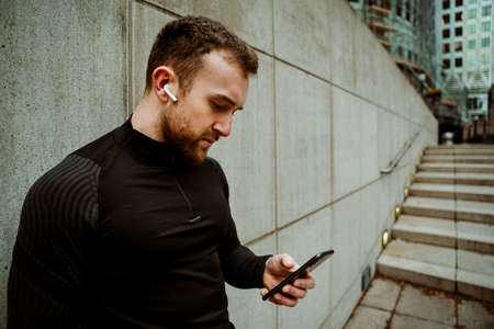 Caucasian male athlete changing music on smartphone while on outdoor run in city
