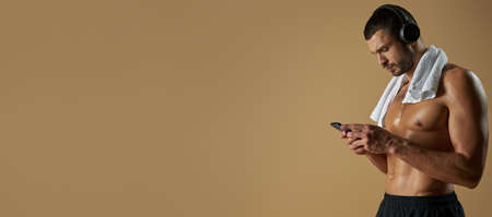 Website header of Focused strong athlete in black sportswear with towel on his shoulder standing in studio with modern device