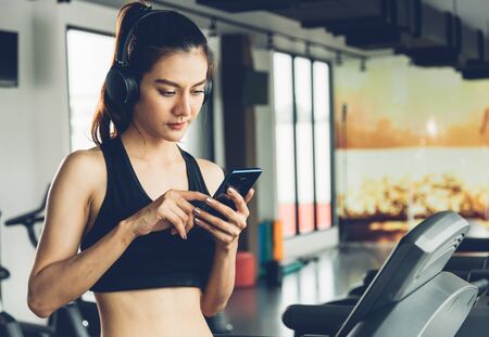 healthy asian woman in sportwear relax and enjoy song from smartphone after workout in gym