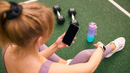 Overhead Shot Of Woman Exercising With Weights Checking Health Monitoring App On Mobile Phone