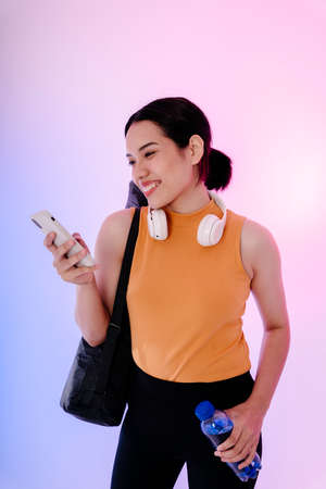 Young asian happy woman sitting and listening to music by smartphone while having exercise break at the gym