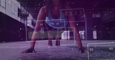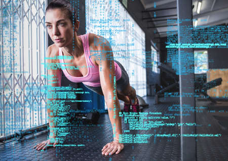 Data processing against caucasian fit woman performing push up exercise at the gym. sports, fitness and technology concept