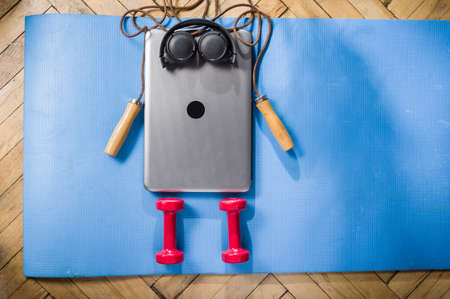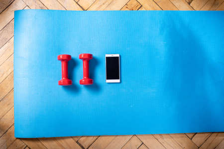 Exercise at home. Tennis, yoga mat, dumbbells and cell phone to exercise at home.