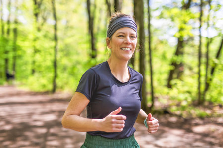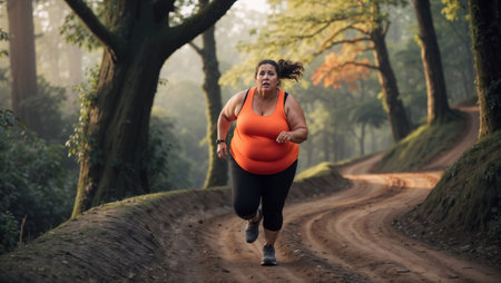 Curvy woman is running on a trail in a forest, enjoying the peace and quiet of nature as she works on her fitness.