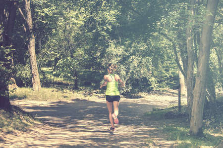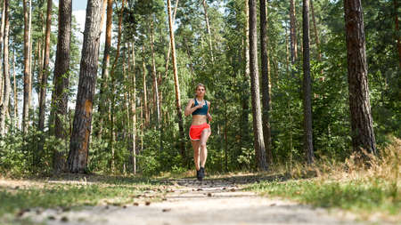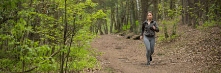 Sporty girl running in the woods for any purpose