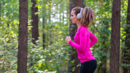 Woman jogging in a forest area and listening to the music via haedphones. Side view.