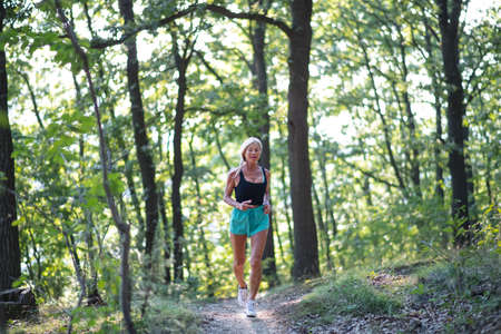 Happy active senior woman jogging outdoors in forest.