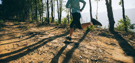 Feet of a runner running on a forest trail