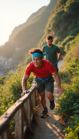 The image captures two enthusiastic men sprinting along a picturesque trail, surrounded by lush greenery and stunning mountain views. The joyful expression of the man in red, paired with the serene backdrop, evokes a sense of adventure and camaraderie in nature.