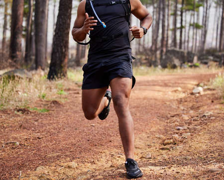 Hispanic unrecognizable fit male athlete running in a forest outside in nature. Exercise is good for health and wellbeing. Jogging in a park alone during the day