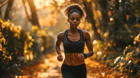 A woman in a sports bra running through the woods, AI