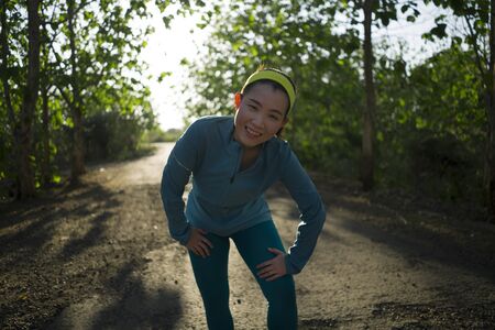 young happy Asian woman resting during running workout in wood on sunset . Attractive and healthy Korean girl panting after jogging in beautiful countryside road with trees background