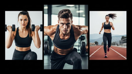 This image presents a montage of athletic individuals engaged in different exercise routines. The composition displays three distinct scenes of people working out with focus on physical prowess. It showcases people training in environments that vary from indoor settings to outdoor tracks, suitable for commercial projects.