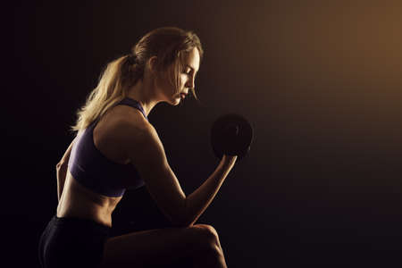 Beautiful fitness model doing exercises with dumbbells in hands on a gray background. Close-up.