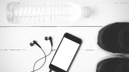 fitness equipment : running shoes,drinking water and phone on white wood table black and white tone color style