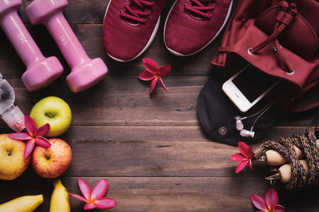 Woman active healthy lifestyle concept. Weight and dieting concept. Creative flat lay of sport and fitness equipments with woman accessories, apples, bottle of waters, sports shoes and dumbbells.